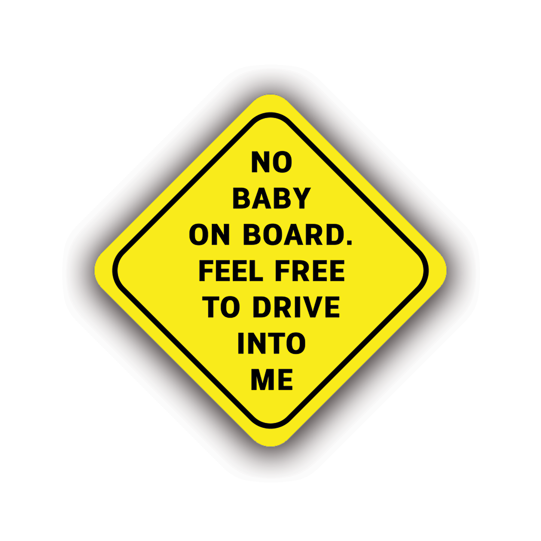 Naklejka NO BABY ON BOARD. FEEL FREE TO DRIVE INTO ME to przewrotna odpowiedź na popularne oznaczenia „Baby on Board”. Mocny, czarny napis na żółtym tle w formie znaku drogowego przyciąga wzrok i od razu zdradza ironiczny charakter kierowcy. To idealny bumper sticker dla osób, które lubią sarkastyczny humor i chcą wyróżnić się na drodze nietypowym komunikatem.