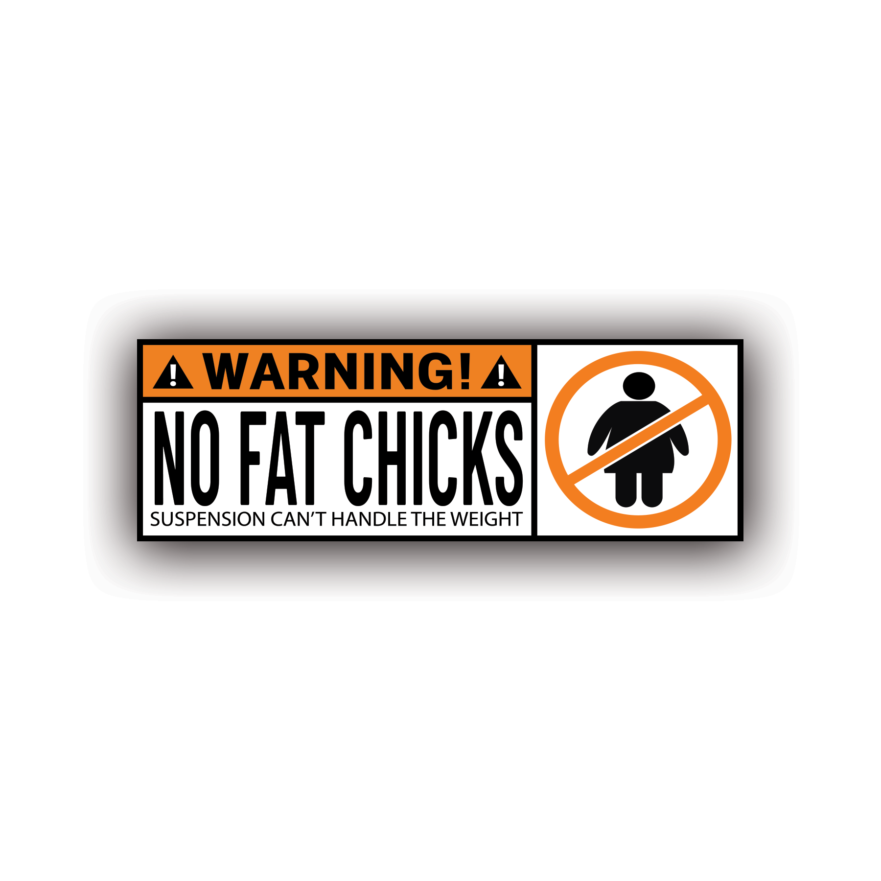 Naklejka WARNING! NO FAT CHICKS – Suspension can’t handle the weight to klasyczny przykład kontrowersyjnego humoru rodem z amerykańskich bumper stickers. Utrzymana w stylistyce znaku ostrzegawczego, z mocnym kontrastem pomarańczowo-czarno-białych elementów, przyciąga uwagę i nie pozostawia nikogo obojętnym. To propozycja dla kierowców, którzy lubią ostry żart i nie boją się prowokacyjnych komunikatów.